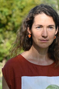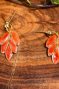 Porcelain leaf shaped earrings in a burnt red colour called Cinnabar. Lightweight and set on a gold plated alloy stud post.