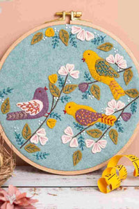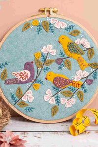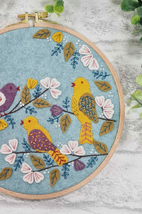 This embroidered appliqué felt decoration features a blossoming tree and birds in a 19cm wooden hoop frame.