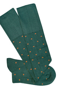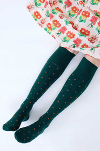 Cute Dotty knee high cotton socks in Bottle Green with orange spots.