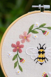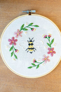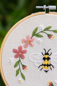 This beginner-friendly embroidery kit celebrates our most important pollinators with a wreath of pink wildflowers and delicate white daisies surrounding an adorable bumblebee.