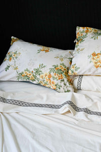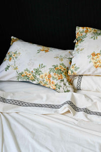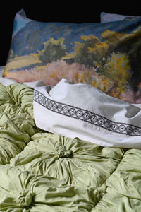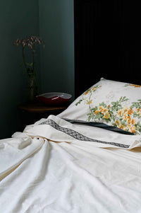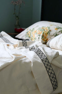 Unbleached natural organic cotton sateen with dark charcoal embroidery panel on sheet turn back and pillowcases.