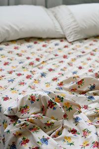 Fresh and happy vintage floral sheet set. Add some colour and prettiness to your bedroom with this soft organic cotton sheet set. Floral posy design on a aged cream background