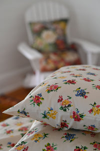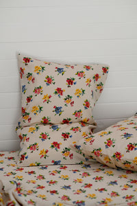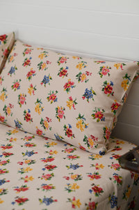 Fresh and happy vintage floral sheet set. Add some colour and prettiness to your bedroom with this soft organic cotton sheet set. Floral posy design on an aged cream background.