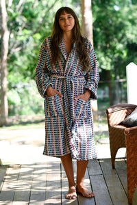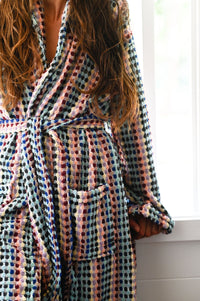 The robe includes two pockets and a belt and is soft and cosy to wear.