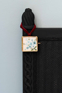 Locket style with hinge, comes with a velvet ribbon attached to hang it.