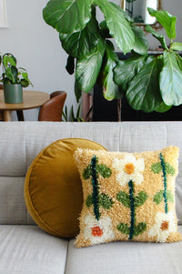 Soft browns and olive greens grace this cushion cover with a simple floral motif.