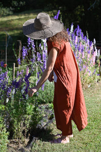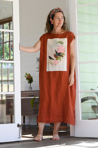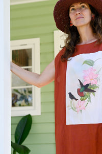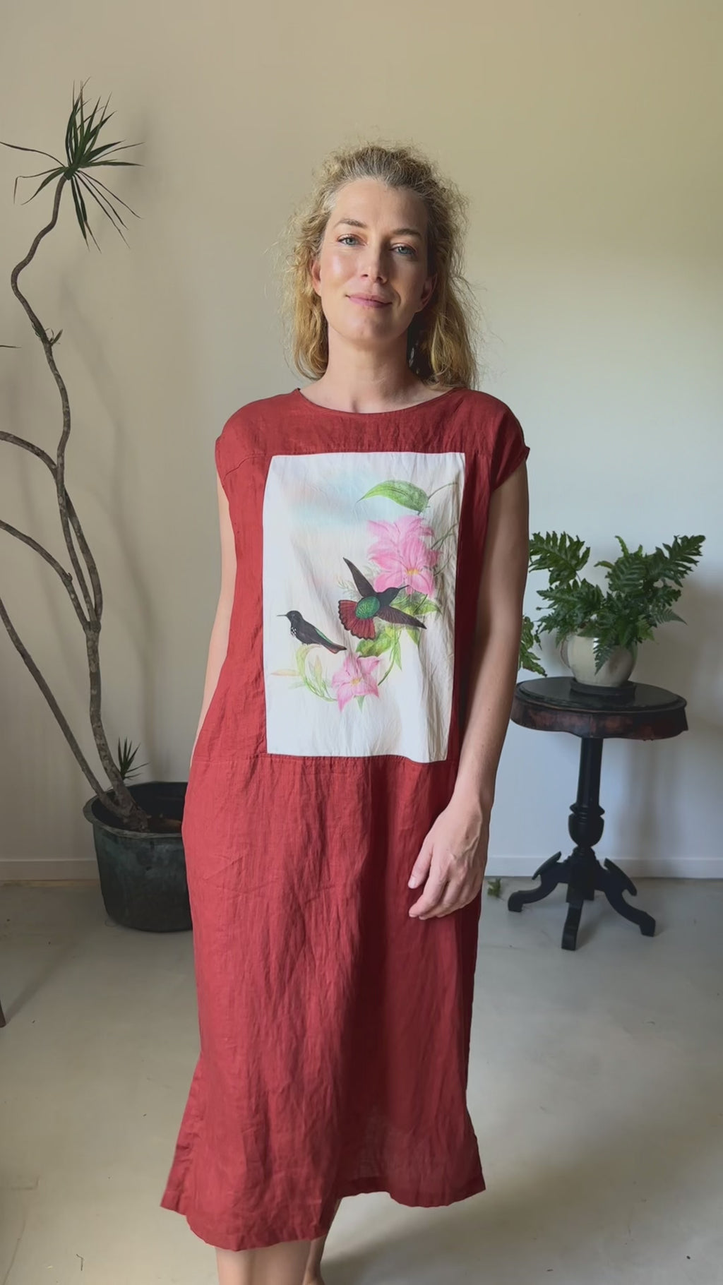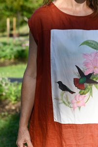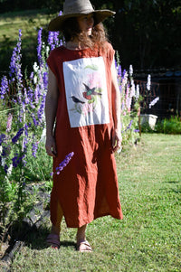 This time we have brought her back in a lovely spicy russet colour with a Hummingbird print on organic cotton in the front.