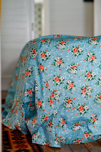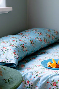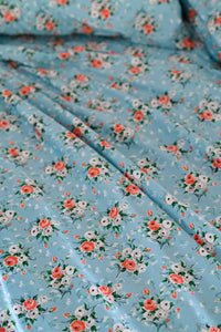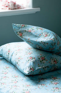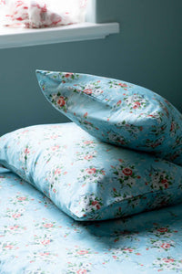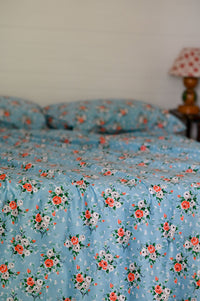 Rosebank is a vintage Lazybones print brought back to celebrate our 25th year! Beautiful colours to brighten up your bedroom. A gorgeous sky blue background with coral, grey and white rose design.