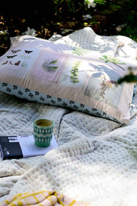 Scrapbook set of 2 reversible pillowcases takes inspiration from a nature lover's scrapbook. Featuring drawings and illustrations of birds and plants on one side and a vintage 50s print on the reverse.