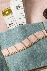 The sewing roll folds in three and is closed with a pretty gingham ribbon you can embellish with thread. It has pockets for buttons, thread, a thimble and scissors, needles and tape holder, and even a detachable pin cushion.