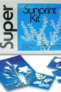 This kit includes 12 sheets of sunprint paper and 1 acrylic sheet (all you need is a piece of cardboard, a tub of water and some fun and interesting objects to print)