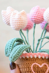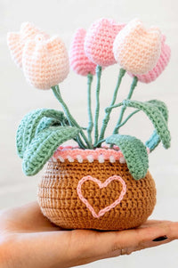 This Tulip Pot Crochet Kit features soft pink and white tulips, charming leafy greens, and a cute pot with a stitched heart.
